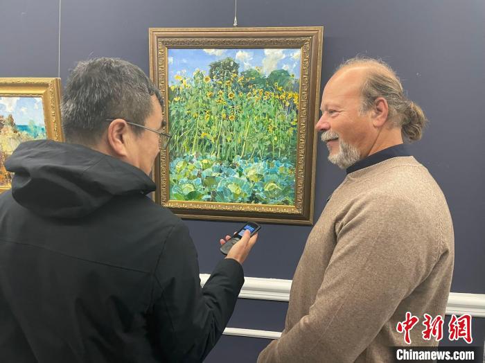 俄羅斯畫家介紹自己創(chuàng)作的畫作。劉錫菊 攝