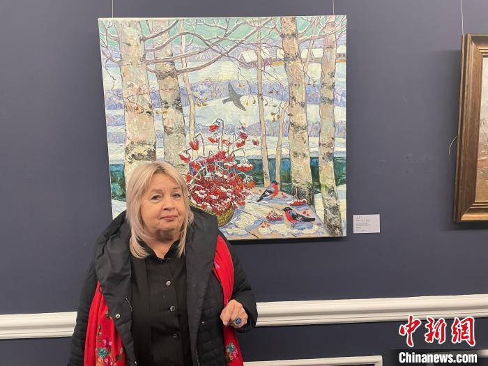 俄羅斯功勛藝術(shù)家、俄羅斯美術(shù)家協(xié)會烏蘇里斯克分會成員尼基奇克·奧爾佳·基莫夫娜與其創(chuàng)作的畫作。劉錫菊 攝