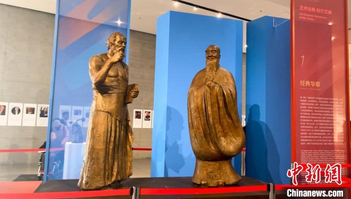 走進(jìn)藝術(shù)館,首先映入眼簾的是孔子和蘇格拉底的“對(duì)話”,這是中國(guó)雕塑家吳為山的作品。這樣跨越時(shí)空的“對(duì)話”,正是此次展覽的一個(gè)縮影。