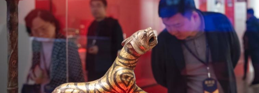 11月6日,南京博物院迎來建院90周年之際,“九十年春華秋實——南京博物院的珍藏”特展揭開面紗,帶來一場精彩的文博盛宴。本次展覽以南京博物院90年院史為主線,以40余萬件文物收藏史為綱,釉里紅歲寒三友紋梅瓶、景德鎮(zhèn)官窯青花萬壽紋瓷尊等數(shù)百件罕見的“國寶天團(tuán)”集中亮相。圖為展出的2011年出土于江蘇盱眙大云山江都王陵的錯金銅虎。