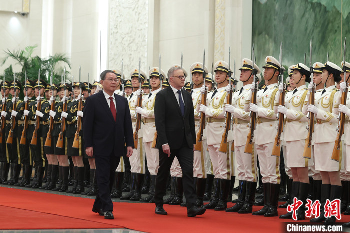 11月7日上午,中國國務(wù)院總理李強在北京人民大會堂同來華進行正式訪問的澳大利亞總理阿爾巴尼斯舉行會談。會談前,李強在人民大會堂北大廳為阿爾巴尼斯舉行歡迎儀式。 中新社記者 蔣啟明 攝