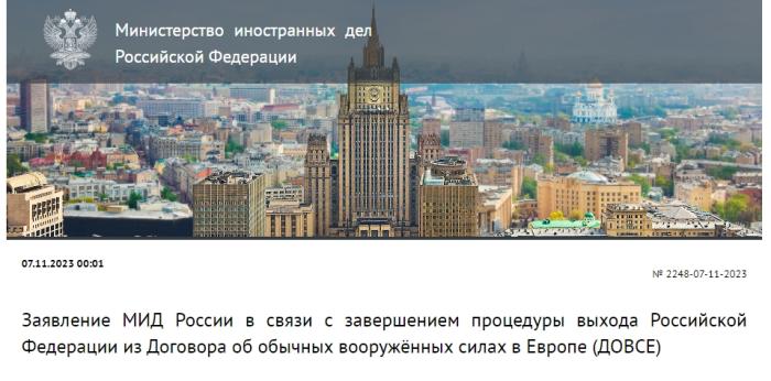 據(jù)報(bào)道,俄外交部網(wǎng)站上發(fā)布的官方聲明稱:“2023年11月7日零時(shí)完成了《歐洲常規(guī)武裝力量條約》規(guī)定的俄羅斯退出該條約的程序。這樣一來,我國還在2007年就暫停其效力的這一國際法律文件對(duì)我國來說已徹底成為歷史。”