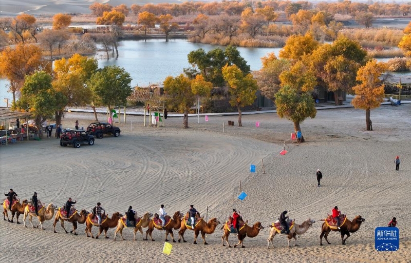 游客在新疆尉犁縣羅布人村寨景區(qū)騎駱駝游覽觀光(11月3日攝,無人機照片)。