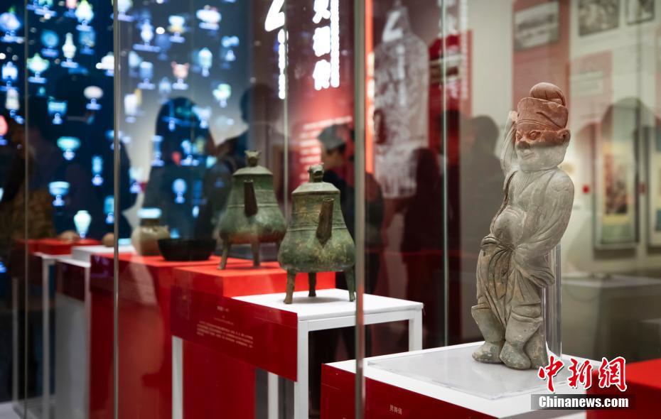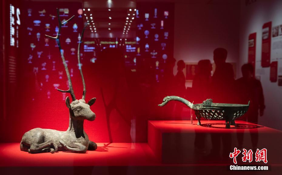 11月6日,南京博物院迎來(lái)建院90周年之際,“九十年春華秋實(shí)——南京博物院的珍藏”特展揭開(kāi)面紗,帶來(lái)一場(chǎng)精彩的文博盛宴。本次展覽以南京博物院90年院史為主線(xiàn),以40余萬(wàn)件文物收藏史為綱,釉里紅歲寒三友紋梅瓶、景德鎮(zhèn)官窯青花萬(wàn)壽紋瓷尊等數(shù)百件罕見(jiàn)的“國(guó)寶天團(tuán)”集中亮相。圖為展陳的1970年出土于江蘇徐州土山漢墓的東漢時(shí)期三足鏤空銅器(右)、1965年出土于江蘇漣水三里墩西漢墓的戰(zhàn)國(guó)時(shí)期銅鹿(左)。中新社記者 泱波 攝