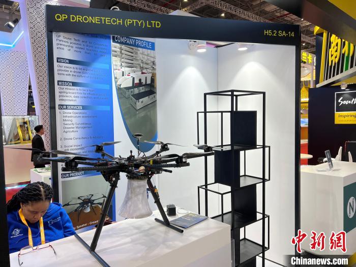 11月7日,第六屆中國國際進(jìn)口博覽會國家展區(qū)的南非館,展臺上擺放著一架無人機(jī)。中新社記者 馬德林 攝