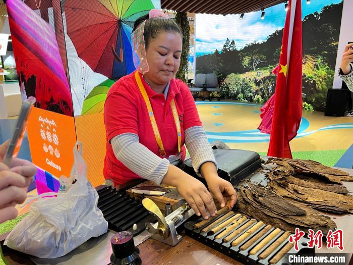 11月7日,第六屆中國國際進(jìn)口博覽會國家展區(qū)的洪都拉斯館,一位洪都拉斯工作人員正在展示手工制作雪茄。中新社記者 馬德林 攝