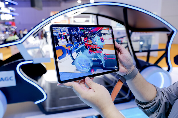 今年,互動(dòng)性和沉浸式是AGC展臺(tái)的一大亮點(diǎn),體驗(yàn)者絡(luò)繹不絕。隨參觀者腳步而變化的"光學(xué)科技之路"互動(dòng)地屏,以時(shí)間為主線引領(lǐng)觀眾從AGC的過去走向未來,并通過圖片了解AGC的發(fā)展。位于展臺(tái)入口的模型汽車集合車載顯示器蓋板玻璃、車載投影屏、星空頂天幕、車載裝飾蓋板玻璃、覆銅板、車載LiDAR產(chǎn)品等,利用AR互動(dòng),讓參觀者沉浸式體驗(yàn)到AGC如何用"光"為不同應(yīng)用領(lǐng)域提供價(jià)值。