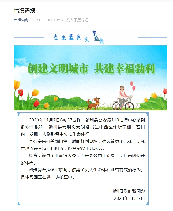 中新網(wǎng)11月7日電 據(jù)黑龍江勃利縣委宣傳部官方微信消息,黑龍江省勃利縣政府新聞辦7日發(fā)布《情況通報》。2023年11月7日6時37分許,勃利縣公安局110指揮中心接到群眾舉報稱:勃利縣元明街元明路景生中西醫(yī)診所南側(cè)一巷口內(nèi),發(fā)現(xiàn)一人倒臥雪中失去生命體征。