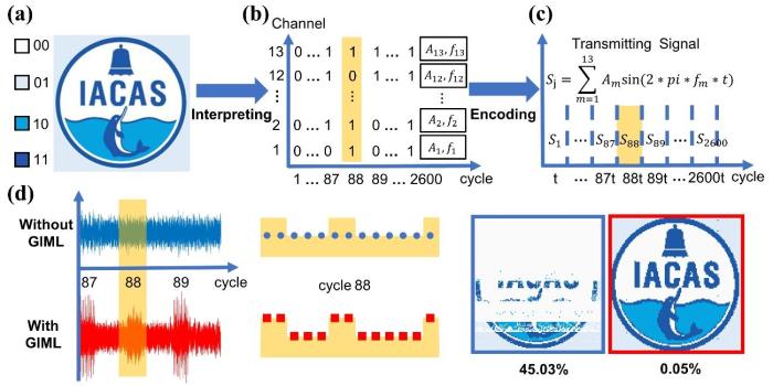 本項研究中,該團隊進一步將聲學所的所徽圖案通過頻分復用的方式編碼在匹配層的透射頻帶內(nèi)進行傳輸,圖案以13個通道進行并行傳輸,傳輸準確率達到99.95%,實現(xiàn)了水和空氣間的高容量精確通信。