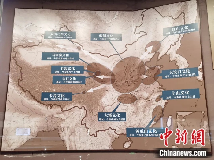 國(guó)家民委主辦的“鑄牢中華民族共同體意識(shí)文物古籍展”正在民族文化宮展出。圖為展覽中展出的新石器時(shí)代的馬家窯文化、齊家文化、辛店文化、寺洼文化、卡約文化、紅山文化的位置示意圖。民族文化宮供圖