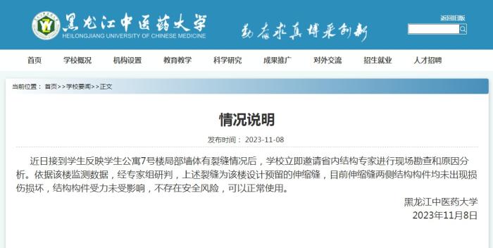 中新網(wǎng)11月9日電 據(jù)黑龍江中醫(yī)藥大學(xué)網(wǎng)站消息,近日,黑龍江中醫(yī)藥大學(xué)接到學(xué)生反映學(xué)生公寓7號(hào)樓局部墻體有裂縫情況后,學(xué)校立即邀請(qǐng)省內(nèi)結(jié)構(gòu)專家進(jìn)行現(xiàn)場(chǎng)勘查和原因分析。依據(jù)該樓監(jiān)測(cè)數(shù)據(jù),經(jīng)專家組研判,上述裂縫為該樓設(shè)計(jì)預(yù)留的伸縮縫,目前伸縮縫兩側(cè)結(jié)構(gòu)構(gòu)件均未出現(xiàn)損傷損壞,結(jié)構(gòu)構(gòu)件受力未受影響,不存在安全風(fēng)險(xiǎn),可以正常使用。