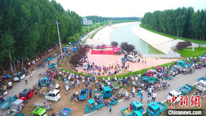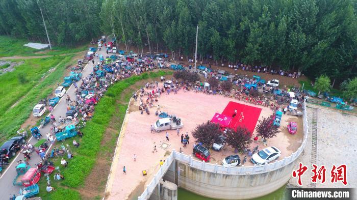 在南水北調(diào)山東省聊城市茌平區(qū)馬頰河與運河交匯處的文化小廣場,來自茌平區(qū)賈寨鎮(zhèn)雙河演藝隊的隊員們?yōu)榇迕裱莩鼍蚀逦乃嚬?jié)目。(無人機照片)。趙玉國攝