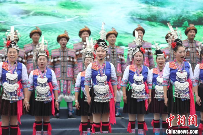 近日,在第二十屆中國(guó)(柳州·三江)侗族多耶節(jié)上,廣西三江縣侗族民眾在演唱侗族大歌。龔普康 攝
