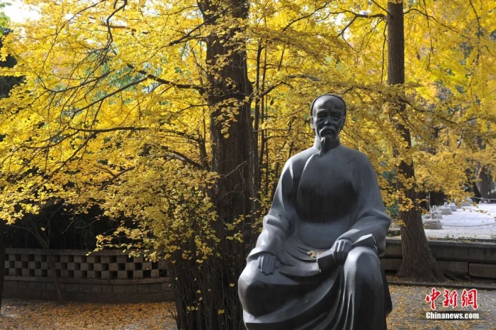 山東青島市嶗山太清宮,坐落在千年銀杏樹前的蒲松齡塑像。王海濱 攝