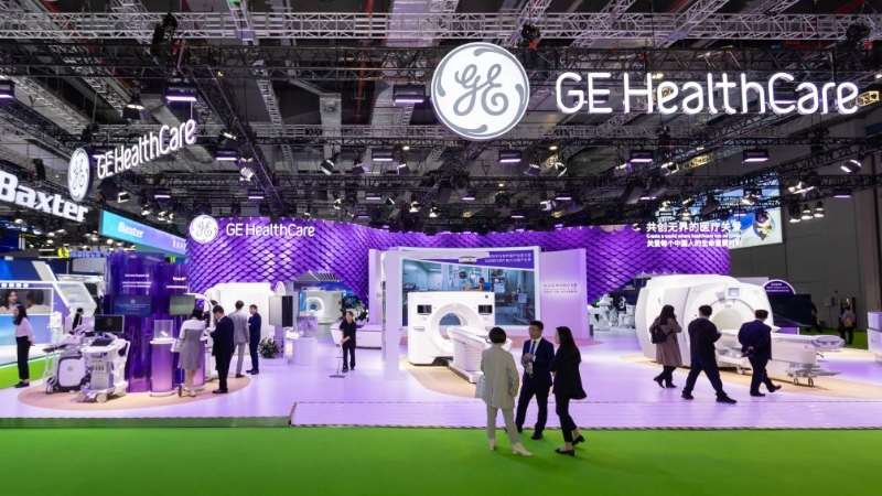 11月8日在第六屆進(jìn)博會醫(yī)療器械及醫(yī)藥保健展區(qū)拍攝的GE醫(yī)療展位。