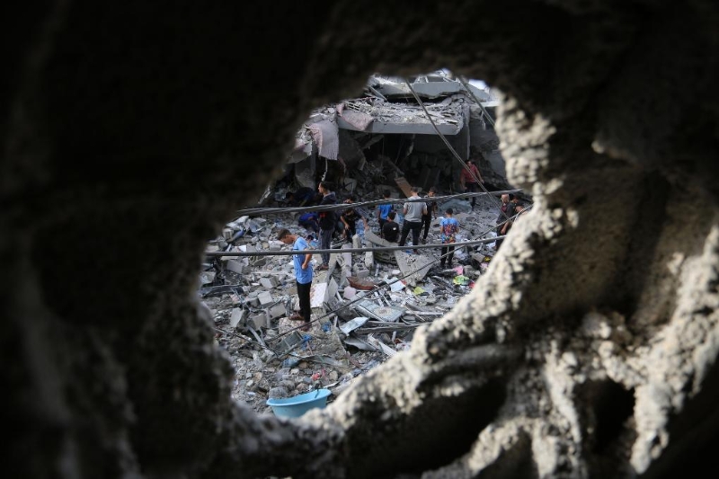 11月11日,在加沙地帶南部城市拉法,人們查看遭以色列襲擊后的建筑。新華社發(fā)(哈立德·奧馬爾攝)