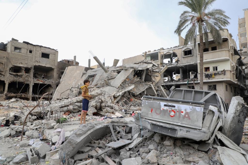 11月12日,一名兒童站在加沙地帶南部城市汗尤尼斯損毀的建筑旁。新華社發(fā)(里澤克·阿卜杜勒賈瓦德攝)