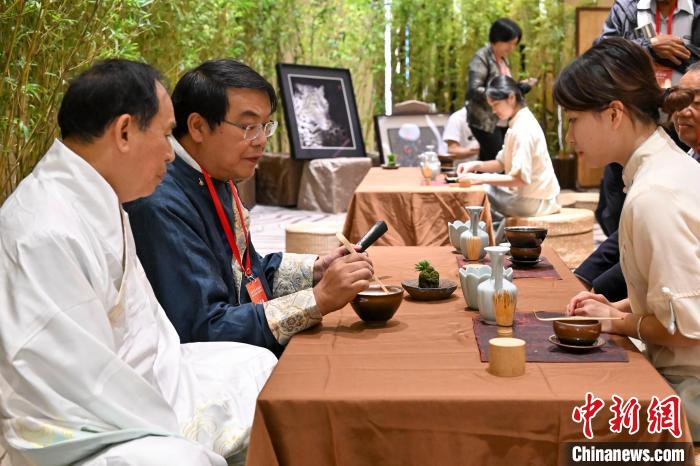 一杯清茶解去鄉(xiāng)愁,一曲琴音撫慰心靈。本次體驗(yàn)名家云集,分為“古韻悠揚(yáng)滿芬芳”“妙手生花繡年華”“丹青點(diǎn)點(diǎn)灑真情”三個(gè)主題內(nèi)容,選取能引起僑胞們共鳴,又具有參與感和體驗(yàn)感的項(xiàng)目或元素:在嶺南古琴的伴奏下,僑胞們或是駐足欣賞由僑界藝術(shù)家、著名生活美學(xué)家顧玉華帶來(lái)的花藝展示,或是靜靜感受宋代點(diǎn)茶的高雅神韻,或是在現(xiàn)代茶席品茗區(qū)品茶香、敘親情,通過(guò)體驗(yàn),重溫嶺南特色非遺的無(wú)窮魅力。
