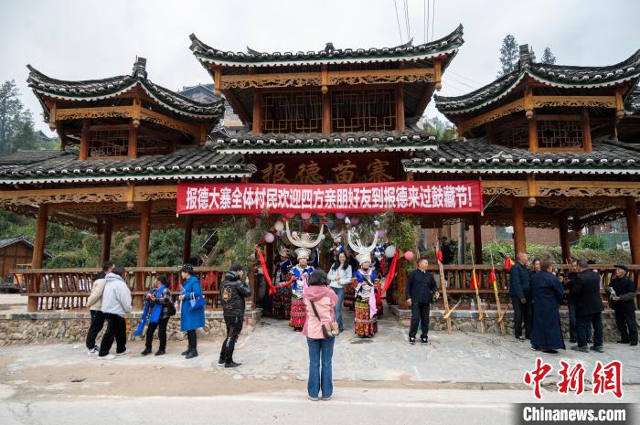 圖為游客與苗族同胞在報德苗寨寨門拍照。唐哲 攝