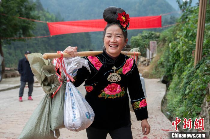 圖為苗族同胞挑禮品過鼓藏節(jié)。唐哲 攝