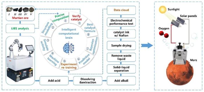 機(jī)器化學(xué)家系統(tǒng)利用火星隕石實(shí)現(xiàn)產(chǎn)氧催化劑無(wú)人化創(chuàng)制的工作流程。中國(guó)科大供圖。