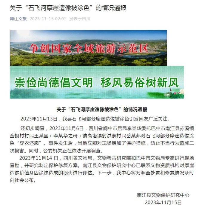 通報指出,11月13日,南江縣石飛河部分摩崖造像被涂色引發(fā)網(wǎng)友廣泛關(guān)注。經(jīng)初步調(diào)查,2023年11月6日,四川省閬中市居民李某華委托巴中市南江縣赤溪鎮(zhèn)金銀村村民王某國(李某華之母)請高塔鎮(zhèn)射洪寨村民岳某邦對石飛河部分摩崖造像涂色“穿衣還愿”。事件發(fā)生后,當?shù)亓⒓磳ΜF(xiàn)場增加了保護措施,防止不當行為造成二次損害。同時,公安機關(guān)正在依法開展調(diào)查。