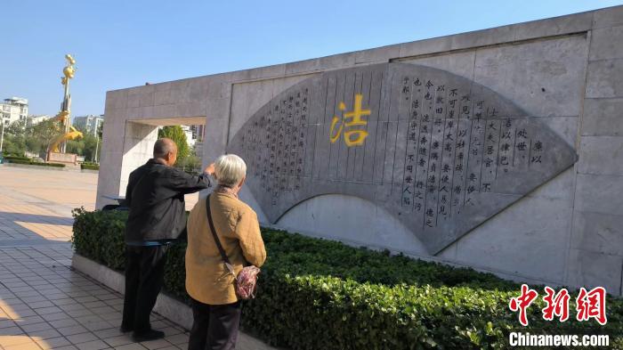 民眾在文化廣場上觀看廉潔語錄。禹城市委宣傳部供圖