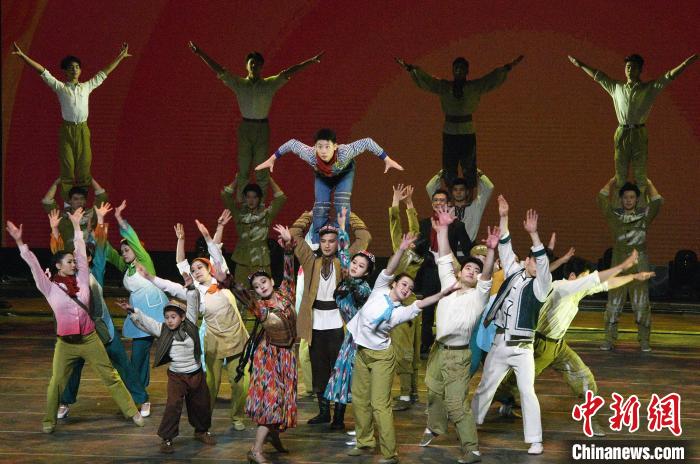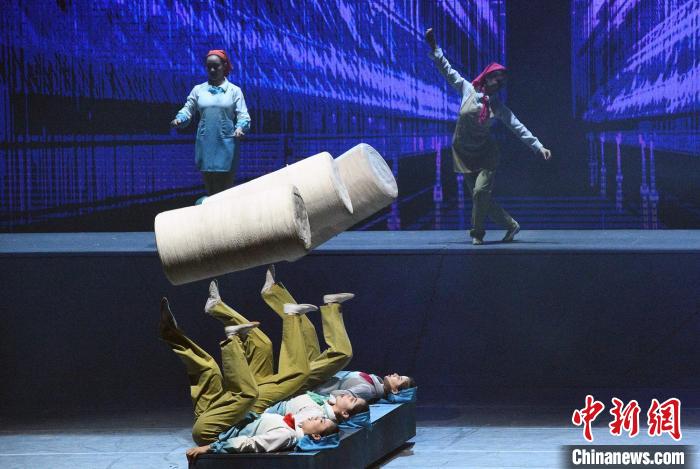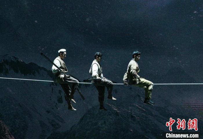 《天山雪》中一只雄鷹從開(kāi)場(chǎng)時(shí)的定格動(dòng)畫(huà)中振翅飛向舞臺(tái),始終貫穿著全劇,讓人感受到建設(shè)新疆歷程之中無(wú)數(shù)人逆風(fēng)飛翔的熱血之魂。中新網(wǎng)記者 孫亭文 攝