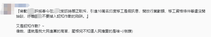 另據(jù)臺(tái)灣《聯(lián)合報(bào)》報(bào)道,許銘春16日到臺(tái)立法機(jī)構(gòu)“社福及衛(wèi)環(huán)委員會(huì)”進(jìn)行業(yè)務(wù)報(bào)告,她在會(huì)前受訪時(shí)宣稱,網(wǎng)上流傳即將引進(jìn)10萬名印度移工是假消息,勞動(dòng)部門懷疑有人刻意操作、散布不實(shí)消息,引起民眾恐慌。她還聲稱民眾不要掉入“認(rèn)知作戰(zhàn)”的陷阱。