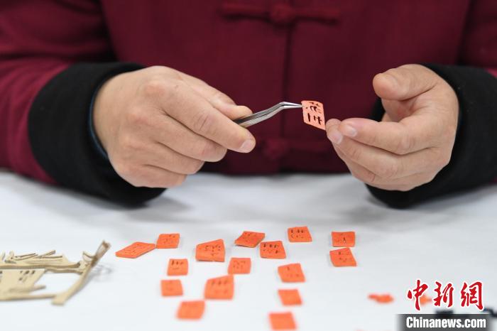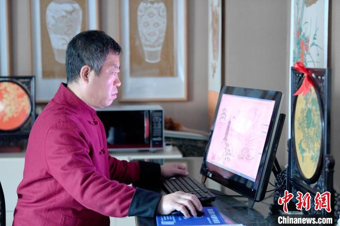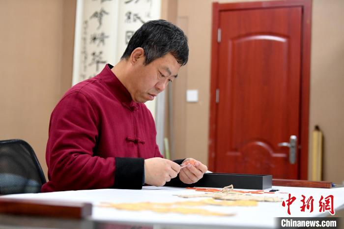 11月17日,劉建國正在進行剪紙作品裝裱準備工作。崔賢飛 攝