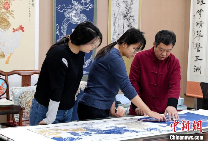 11月17日,劉建國(右一)正在介紹剪紙作品制作過程。崔賢飛 攝