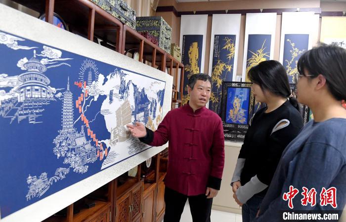 11月17日,劉建國(左一)正在介紹剪紙作品。崔賢飛攝