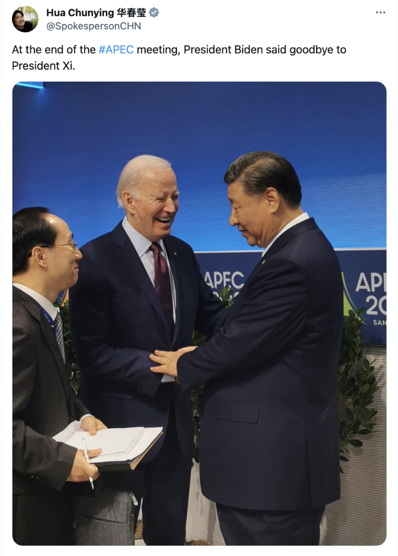 美國舊金山當?shù)貢r間17日,亞太經合組織(APEC)第三十次領導人非正式會議結束時,美國總統(tǒng)拜登與國家主席習近平話別。