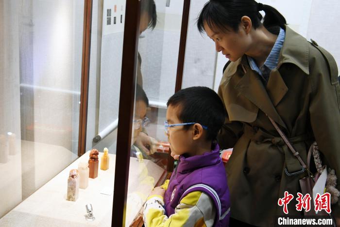 觀眾觀看福建省第三屆篆刻藝術展暨壽山石印鈕雕刻邀請展。 中新網(wǎng)記者 劉可耕 攝