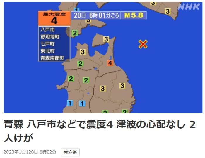 中新網(wǎng)11月20日電 據(jù)日本放送協(xié)會(huì)(NHK)報(bào)道,當(dāng)?shù)貢r(shí)間20日6時(shí),日本青森縣近海發(fā)生5.8級地震,震源深度50千米。