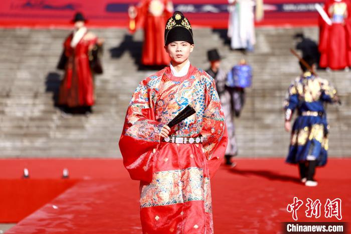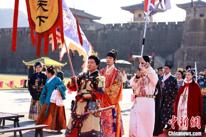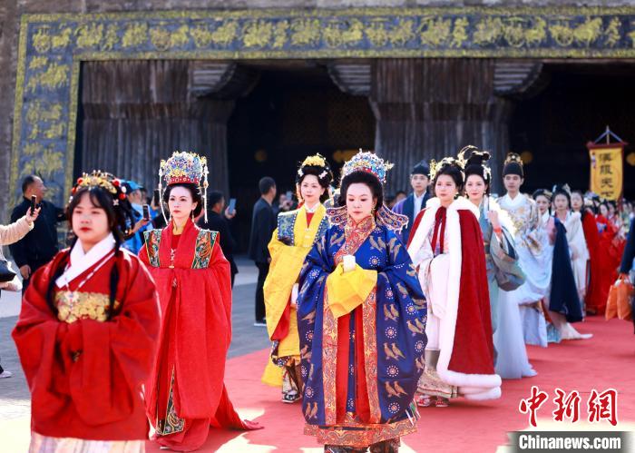 在開幕儀式上,千余名來賓身著華美漢服,整齊列隊(duì),依次邁步入場,在橫店秦王宮中宮門舉行入城儀式。中宮門前,禮樂嘉賓紛紛在“漢”字印章墻上留下印記,傳遞自己對漢服文化的熱忱。主辦方還特別邀請的“神將塔骨”民俗表演加入入場隊(duì)伍中,古老民俗與華美漢服相呼應(yīng),讓傳統(tǒng)融入時(shí)代元素。