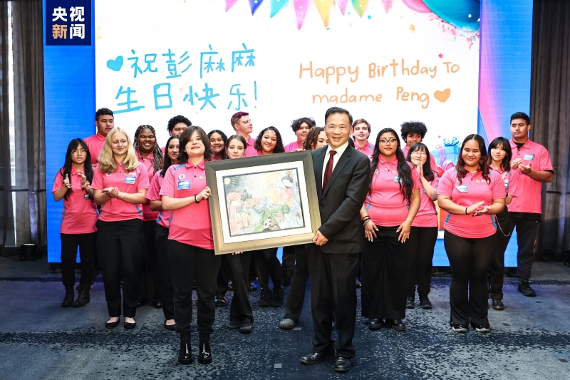 11月16日,中國中央廣播電視總臺與美中青少年學生交流協(xié)會等團體在美國舊金山聯(lián)合舉辦“中美人文交流友好對話”活動。美國華盛頓州塔科馬市林肯中學合唱團學生為習近平主席和夫人彭麗媛精心準備了手繪畫作,用生日賀卡和合唱歌曲為彭麗媛送上生日祝福。中央廣播電視總臺臺長代為接收。