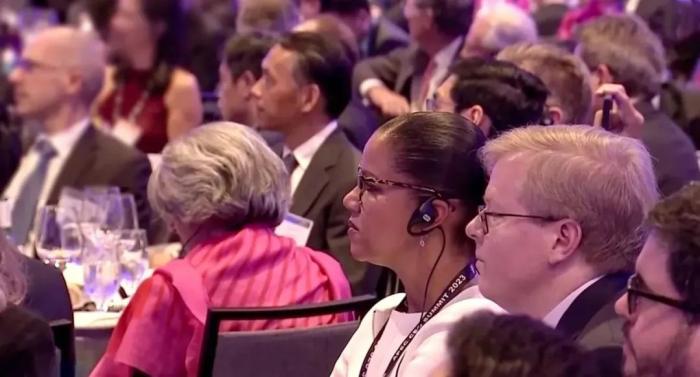 △參加宴會(huì)的人士認(rèn)真聆聽演講。