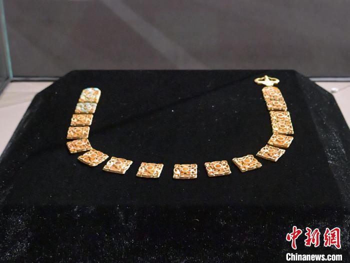 “束帶衿莊——吉林省博物院帶具展”中的嵌綠松石金帶銙?!?攝