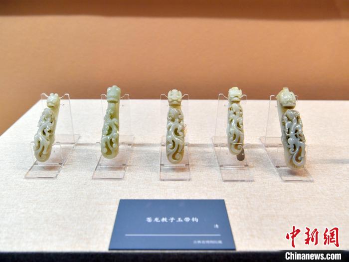 清代,帶鉤的實(shí)用性減弱、賞玩性增強(qiáng),表達(dá)“蒼龍教子”寓意的帶鉤甚為流行。圖為展覽中的一組清代玉帶鉤。 劉棟 攝