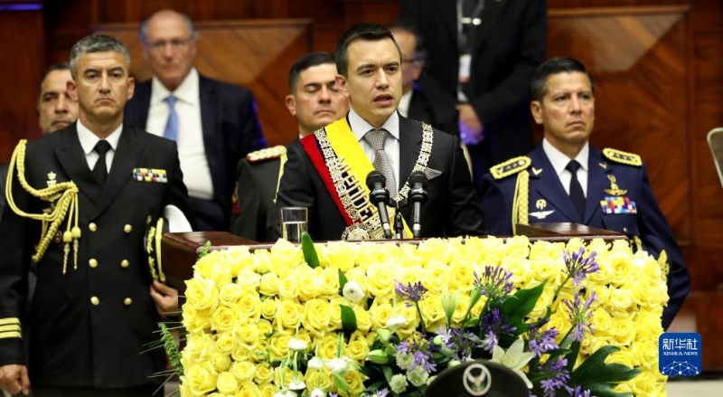 11月23日,厄瓜多爾當(dāng)選總統(tǒng)丹尼爾·諾沃亞(中)在首都基多發(fā)表就職演講。厄瓜多爾當(dāng)選總統(tǒng)丹尼爾·諾沃亞23日在首都基多宣誓就職,任期至2025年5月。新華社發(fā)(厄瓜多爾總統(tǒng)府供圖)
