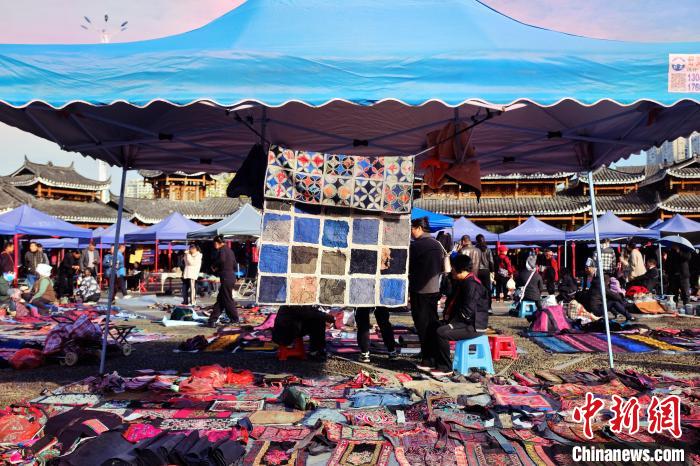 臺灣游客林宜靜和朋友早早來到集市“尋寶”。為方便趕集,她提前一天在集市附近的一家民宿住下,“之前在小紅書上看到這個集市就很喜歡,剛剛逛了一圈下來,各種民族服飾和苗族繡片讓人目不暇接?!?/p>