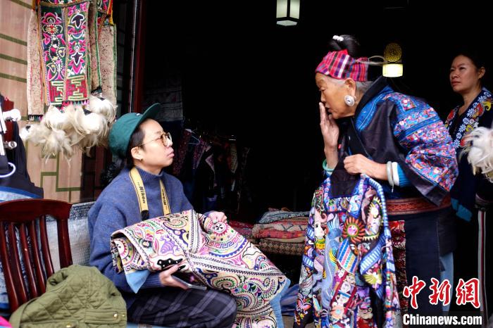 11月22日,“網(wǎng)紅奶奶”潘玉珍為臺灣游客林宜靜介紹苗繡服飾。周燕玲 攝
