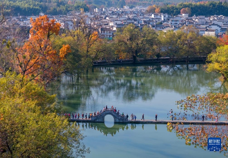 11月25日,游客在黃山市黟縣宏村南湖游覽(無(wú)人機(jī)照片)。