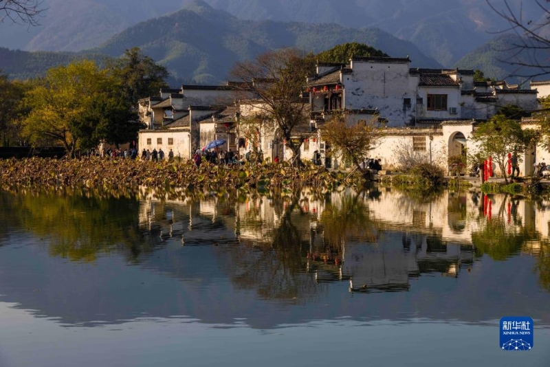 11月25日,游客在黃山市黟縣宏村南湖游覽。