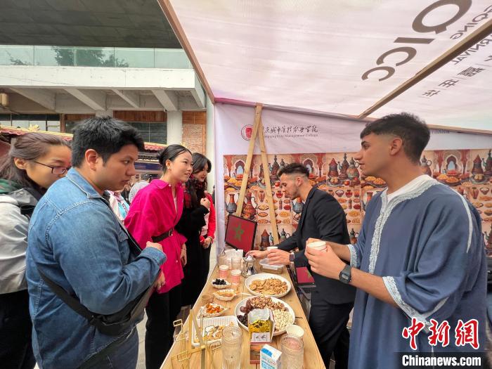 圖為摩洛哥文化展展位,重慶城市管理職業(yè)學(xué)院的摩洛哥國際學(xué)生熱情招呼朋友。中新網(wǎng)記者周毅攝