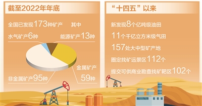 礦產(chǎn)資源是經(jīng)濟社會發(fā)展的重要物質(zhì)基礎,礦產(chǎn)資源勘查開發(fā)事關國計民生和國家安全。截至2022年年底,全國已發(fā)現(xiàn)173種礦產(chǎn);2022年,我國近四成礦產(chǎn)儲量均有上升……日前發(fā)布的《中國礦產(chǎn)資源報告(2023)》顯示,我國推進實施新一輪找礦突破戰(zhàn)略行動效果顯著。