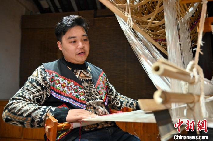 11月23日,廣西來賓市忻城縣,“90后”壯族男子蘭培文正坐在傳統(tǒng)竹籠機前織錦。俞靖 攝