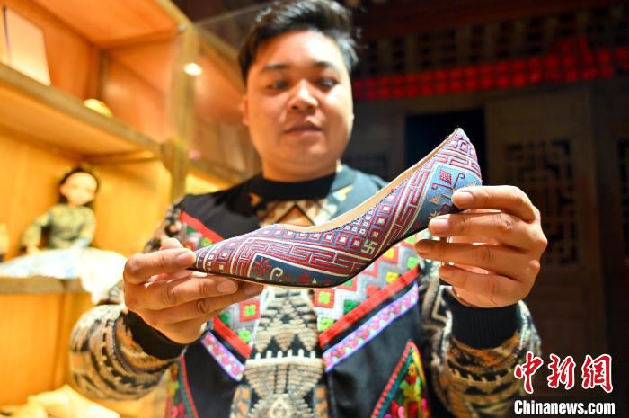 11月23日,蘭培文展示融入壯錦的高跟鞋。俞靖 攝