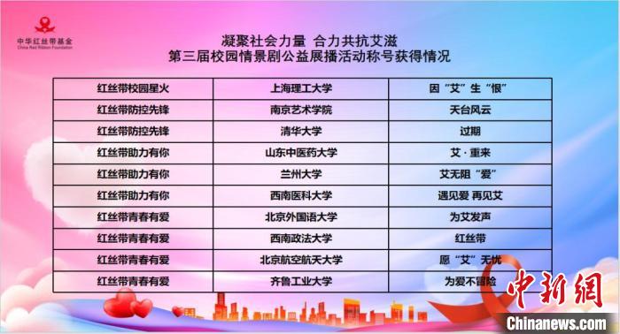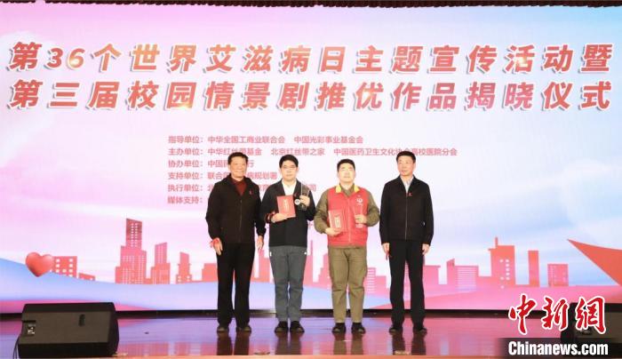 中新網(wǎng)北京11月28日電 12月1日是第36個(gè)世界艾滋病日?!澳凵鐣?huì)力量,合力共抗艾滋”世界艾滋病日主題宣傳活動(dòng)暨第三屆校園情景劇推優(yōu)作品揭曉?xún)x式11月26日在中華全國(guó)工商業(yè)聯(lián)合會(huì)禮堂舉行,10部校園情景劇優(yōu)質(zhì)作品將于11月27日至12月6日間在媒體平臺(tái)展播。